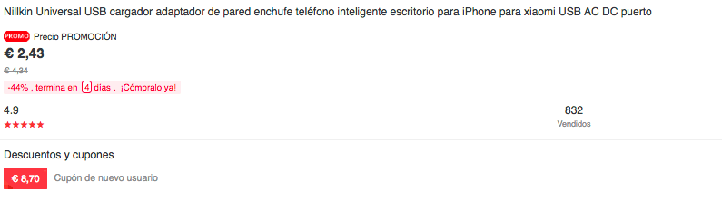 Cargador USB para Smartphone y dispositivos digitales de alta velocidad Nillkin 2A/5V por un precio rebajado de 2,43€ en Aliexpress.
