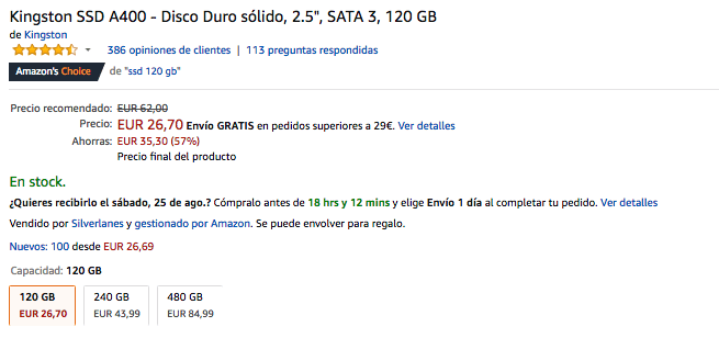 Disco sólido Kingston SSD A400 120 GB por 26,70€ en Amazon