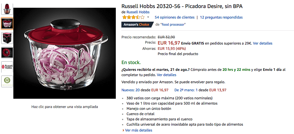 Picadora de verduras marca Russell Hobbs Desire de 380W a un precio promocional de 16,97€.
