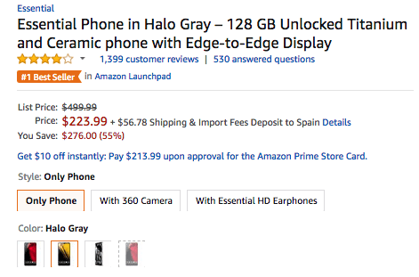 Promoción smartphone Essential Phone PH1 Snapdragon 835 5,71" 4GB de RAM, 128GB de espacio y Android 9.0 por un precio especial de 223,99€