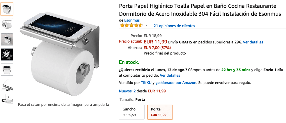 Soporte metálico de papel higiénico y diferentes dispositivos como teléfono móvil a un precio rebajado de 11,9€.