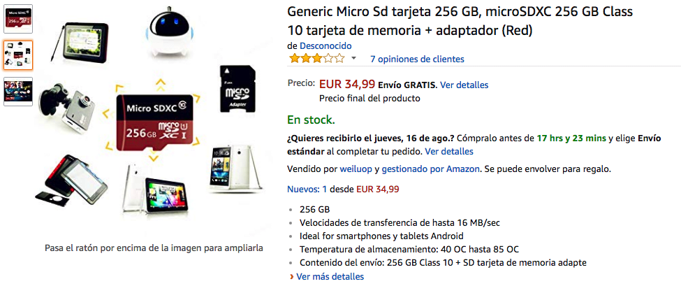Tarjeta MIcro SD microSDXC de 256 GB con adaptador incluido a 34,9€ y envío gratuito con Amazon Prime.