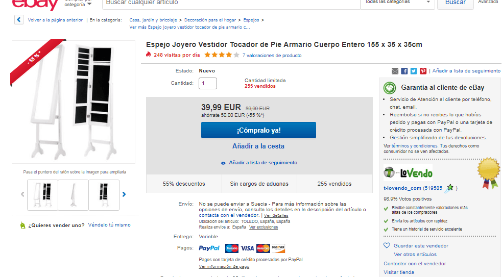 Llevate este espejo de cuerpo Entero medidas 155 x 35 x 35cm que ala ves sirve de armario guarda joyas porun precio mu bajo de 39,99€ sigue el enlace a la tienda Ebay.